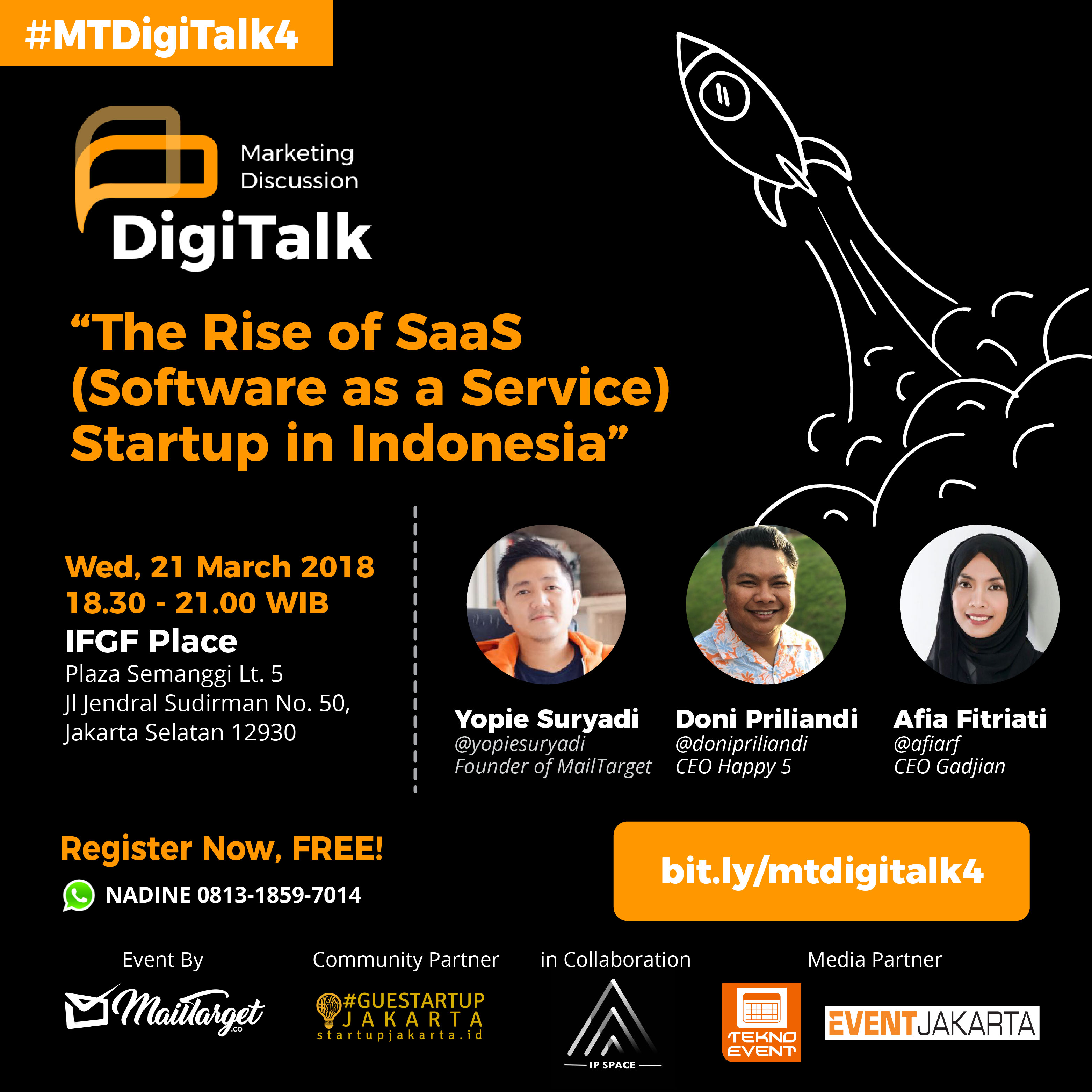 Bagaimana dengan keberadaan perusahaan SaaS di Indonesia? Temukan jawabannya dalam event DigiTalk vol.4 dari MailTarget dengan tema “The Rise of SaaS (Software as a Service) Startup in Indonesia”. Event ini akan menghadirkan 3 pembicara, yaitu : Yopie Suryadi (Founder of MailTarget), Doni Priliandi (CEO Happy 5) dan Afia Efriati (CEO Gadjian).
