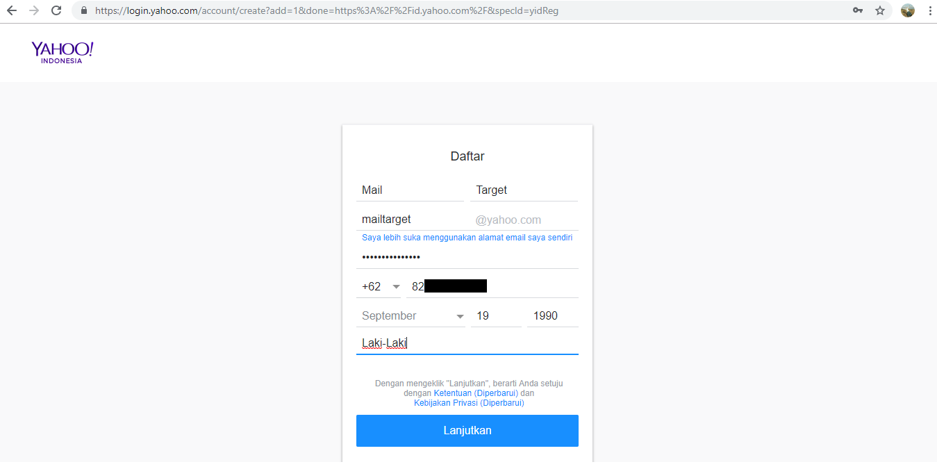 Isi nama depan, nama belakang, alamat email dan kata sandi yang diinginkan. Kemudian isi tanggal lahir dan jenis kelamin Anda, kemudian klik 'lanjutkan'.